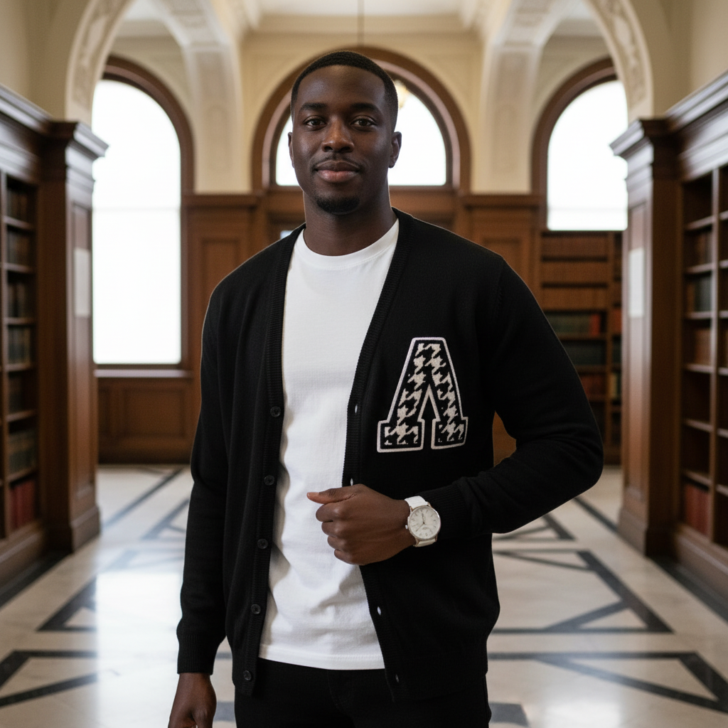 V-neckline with button-front closure, 1x1 rib knit neckline, cuff and bottom, Pill Free Comfortable and fly! Houndstooth Letter on the left chest.